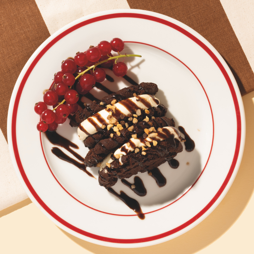 Il existe sur le marché de nombreux brownies prêts à l'emploi pour la restauration. Mais pour être honnête, la plupart d’entre eux n’ont pas le goût du fait maison. Il n’est donc pas surprenant que de nombreux chefs se sentent obligés de préparer leurs propres brownies. Nous importons d'Irlande un brownie vraiment divin. Avec un goût de chocolat si complet. Pas trop sec. Livré congelé, également prédécoupé en forme rectangulaire. Surtout si vous pouvez laisser le brownie quelques secondes de plus au micro-ondes, il deviendra encore plus crémeux. Mais ce qui est bien avec le brownie au fudge mexicain, c'est qu'il contient un tout petit peu de piment ancho, ce qui rehausse vraiment le goût du chocolat.
